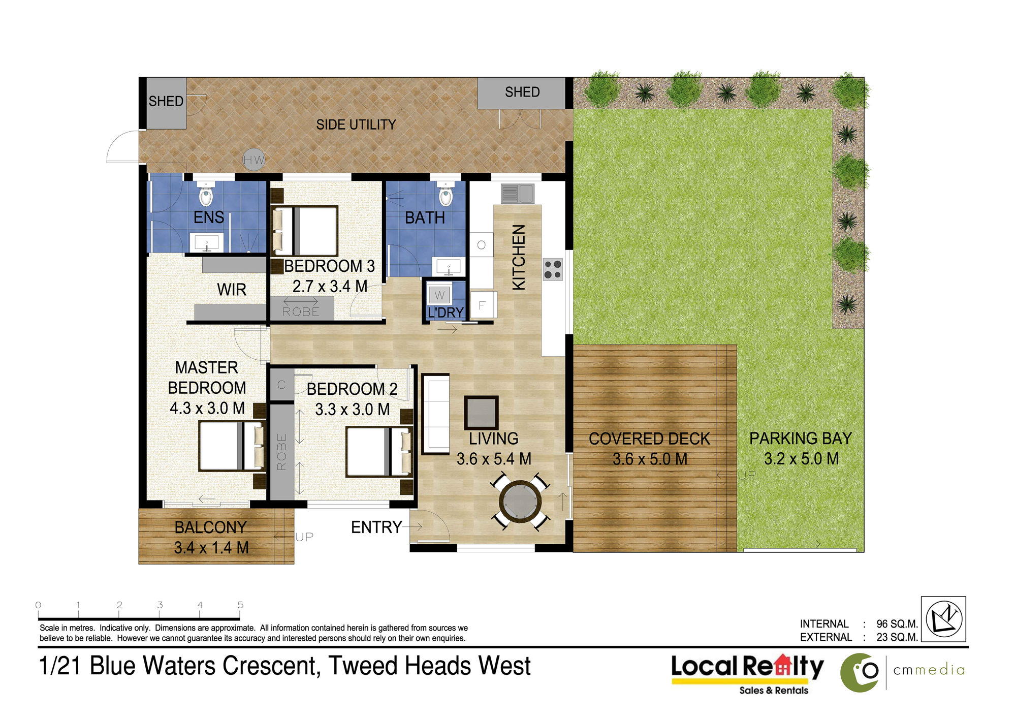 -Internal living size 96sqm, external living area 23sqm; Total of 119sqm